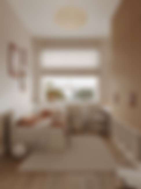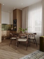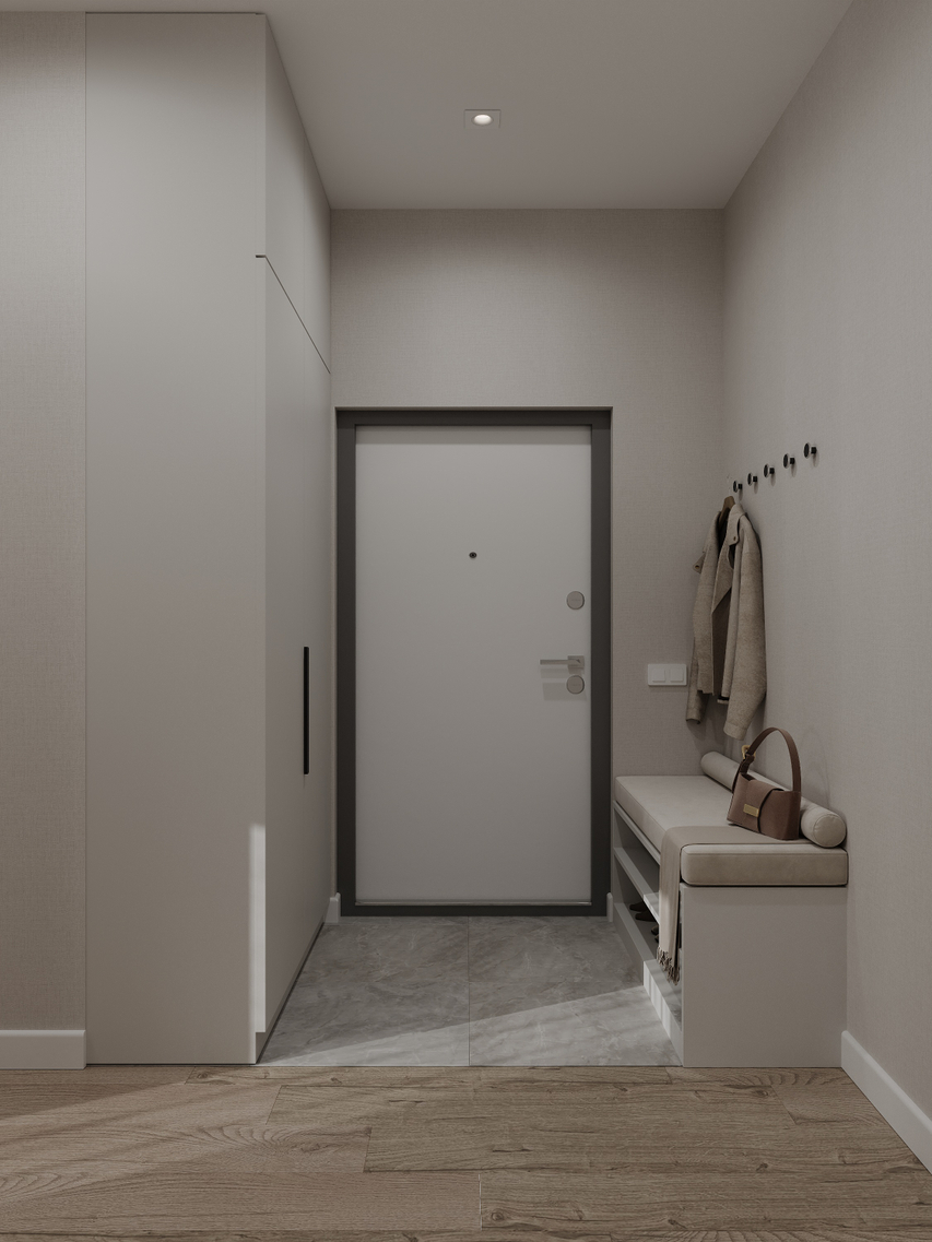Интерьер в кремовой гамме с древесной фактурой пола, теплой палитрой стен и плиткой молочного цвета. Это фон для создания интерьера в согревающих тонах, в котором будут гармонично смотреться природные цвета мебели и натуральный текстиль.